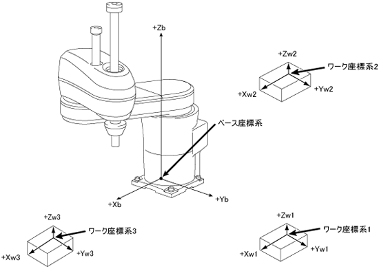 ワーク座標系は、ロボットが操作しようとする対象のワークの作業空間毎に定義される3次元直交座標です。原点は、任意の場所に最大7つ定義できます。下図に示すように、その原点は対象ワークの包絡直方体の一つの頂点となります。ワーク座標はベース座標に対する座標原点位置(X,Y,Z)とベース座標のX軸・Y軸・Z軸周りの回転角(RX,RY,RZ)で表現します。ただし、RXとRYについてはそれぞれRX=0 RY=0 の固定値となります。