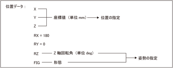 位置データとは、ロボットのフランジ中心(ツール定義が有効なときはツール先端)の位置と、そのときのロボットの姿勢を表す、7要素のベース座標系(ワーク座標系が有効なときはワーク座標系)のデータをいいます。