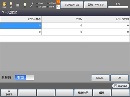 | 簡単教示 | 基準に対して下記3点を教示し、ベース座標を自動計算します。 (1)座標原点 (2)X軸方向 (3)XY平面の点