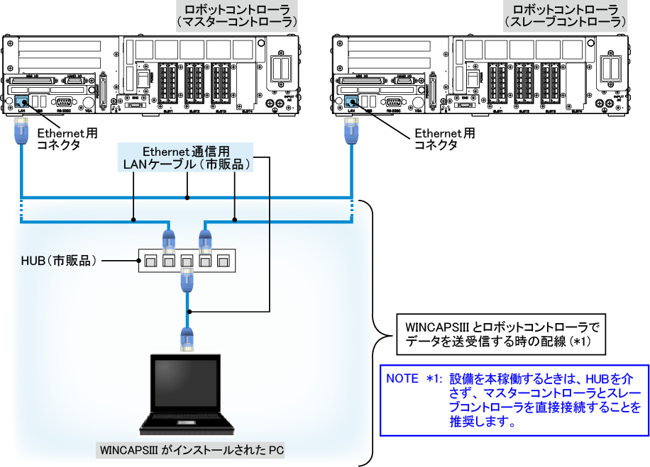 | WINCAPSIIIとロボットコントローラでデータを送受信する時の配線 | 協調機能のシステム調整時には、WINCAPSIIIと、マスターコントローラおよびスレーブコントローラで、データの送受信を行います。その場合は、WINCAPSIIIがインストールされたPC、マスターコントローラ、スレーブコントローラの全てがつながっている必要があります。そのため、上図のように配線します。 |