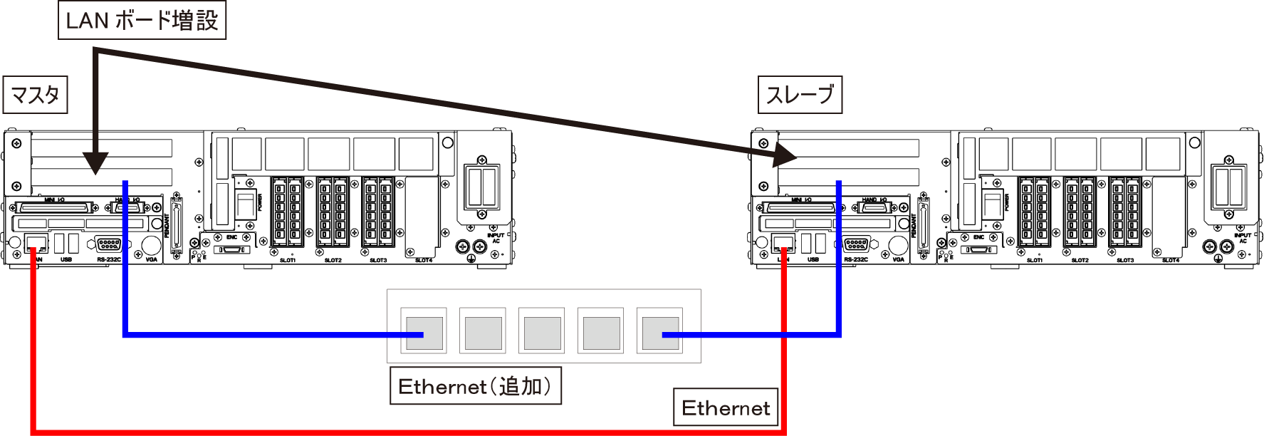 Ethernetのみを使用する場合、ロボットコントローラどうしの配線は下図のようになります。