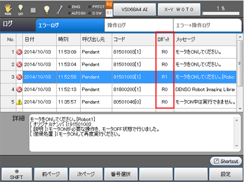 協調機能のエラー表示ではエラー対象のロボットが表示されます。また、「エラーログ」画面にはエラー対象のロボットを示すロボット欄が表示されます。下図を参照してください。