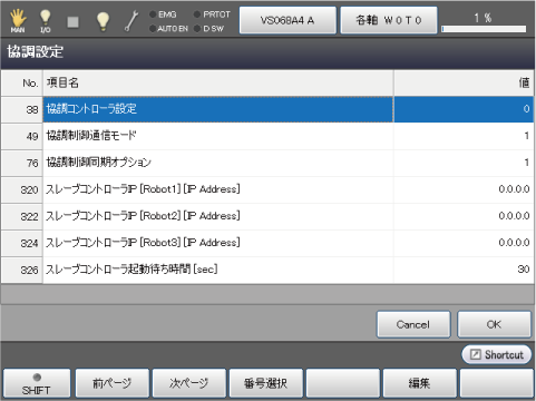 | 協調制御通信モード | ロボットコントローラどうしの通信方法を設定します。通信方法に対する設定値は、以下のとおりです。
