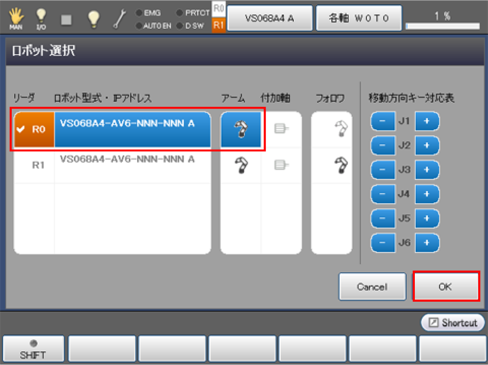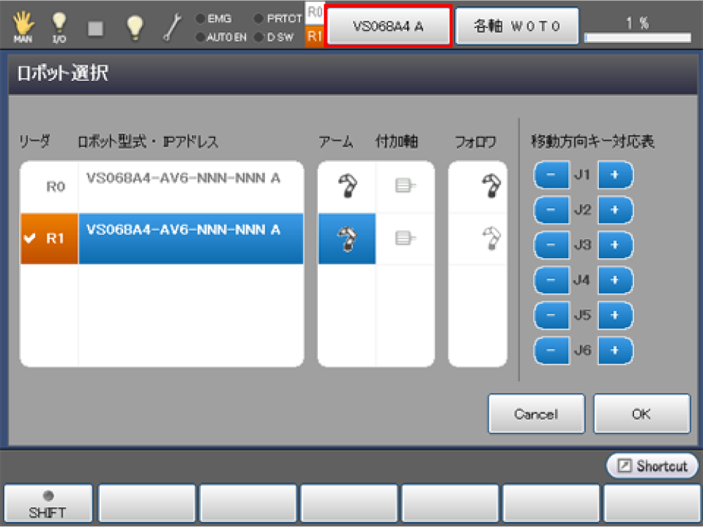 画面上部にある「ロボット選択]ボタンを押して、次のような「ロボット選択」画面を表示します。