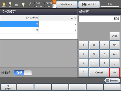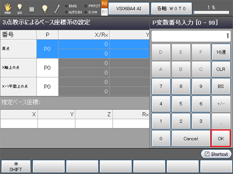 テンキーが表示されますので、テンキーを使って原点の座標が登録してある変数番号を入力して「OK」を押します。
