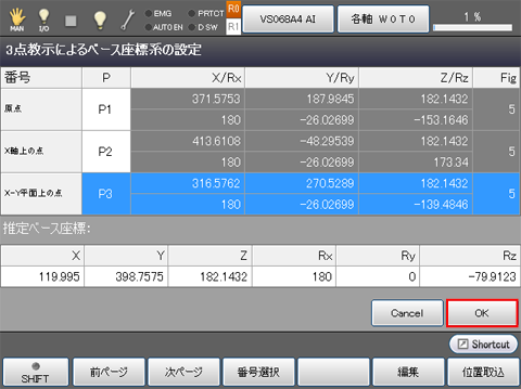 「3点教示によるベース座標系の設定」画面が表示されます。