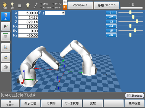 基本画面 - [F2 アーム]を押し、[LOCK]を押して、設定されたベース座標にロボットがあることを確認します。