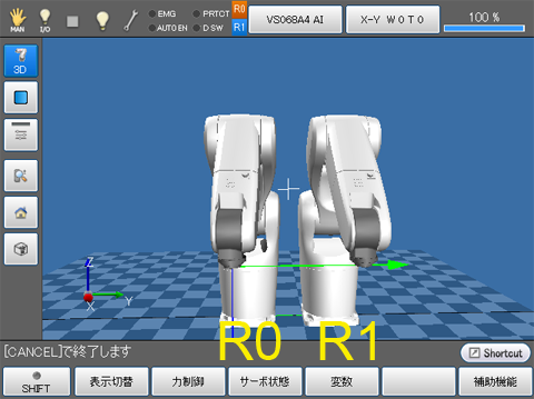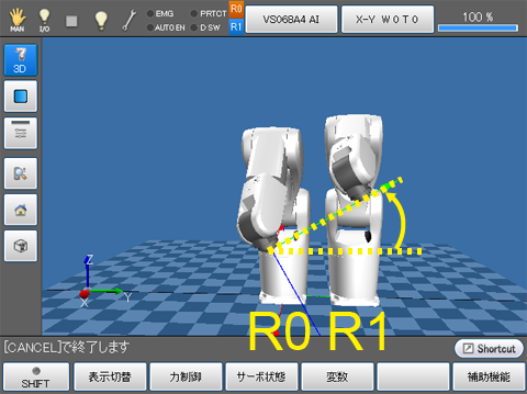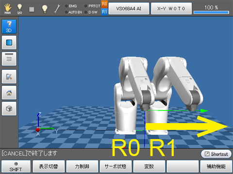 リーダロボットをY+方向へ移動させます。ティーチングペンダントのデットマンスイッチを押しながら移動方向キーJ2/Yの+ボタンを押します。