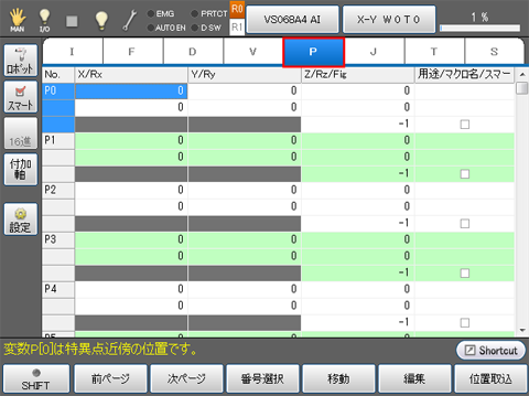 「変数」画面で変数タイプを選択します。画面内の[P変数タブ]を押します。