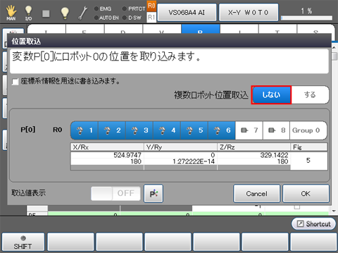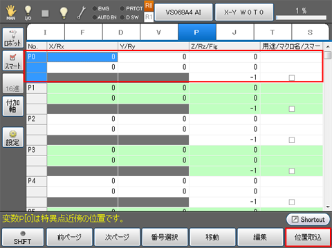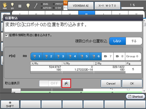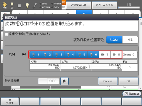 リーダロボットの位置を取り込む変数番号を選択して、[F6 位置取込]を押します。