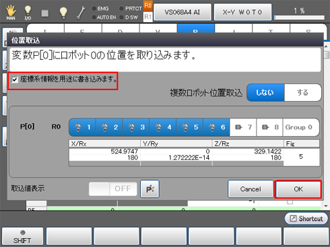 - コントローラ再起動時、「座標系情報を用途に書き込みます。」のチェックは保持されます。(Ver.1.13.*以降)