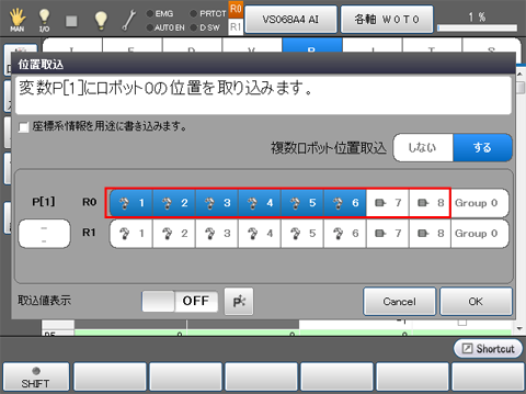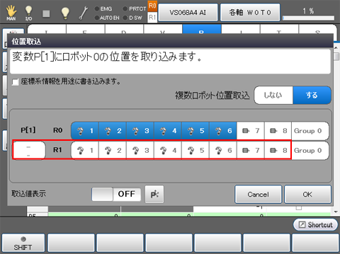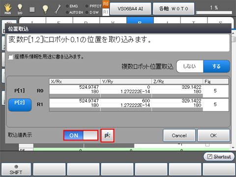「位置取込」画面で「取込値表示」を"ON"にするとロボットの現在位置が表示されます。