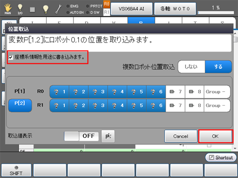 - コントローラ再起動時、「座標系情報を用途に書き込みます。」のチェックは保持されます。(Ver.1.13.*以降)