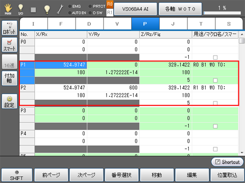 この例ではリーダロボットの位置が変数P1に、2台目のロボットの位置が変数P2に、それぞれ取り込まれています。