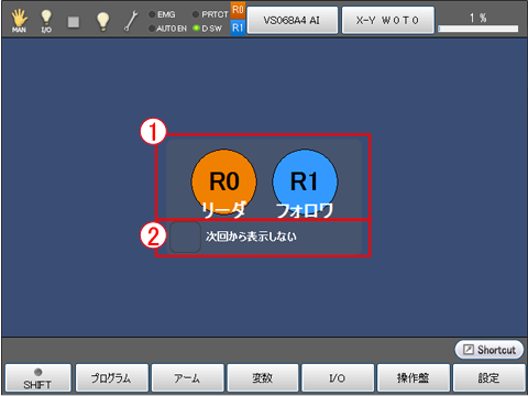 | 1 | ロボット選択状態、およびモータON/OFF状態を表示 | ![]() |
