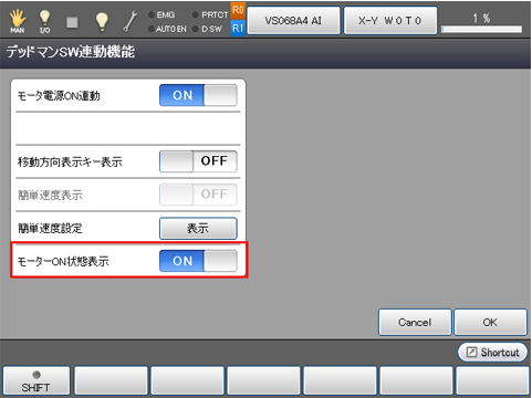 協調用デッドマン連動画面の表示/非表示を設定するには「デッドマンSW連動機能」の"モータON状態表示"をON/OFFします。