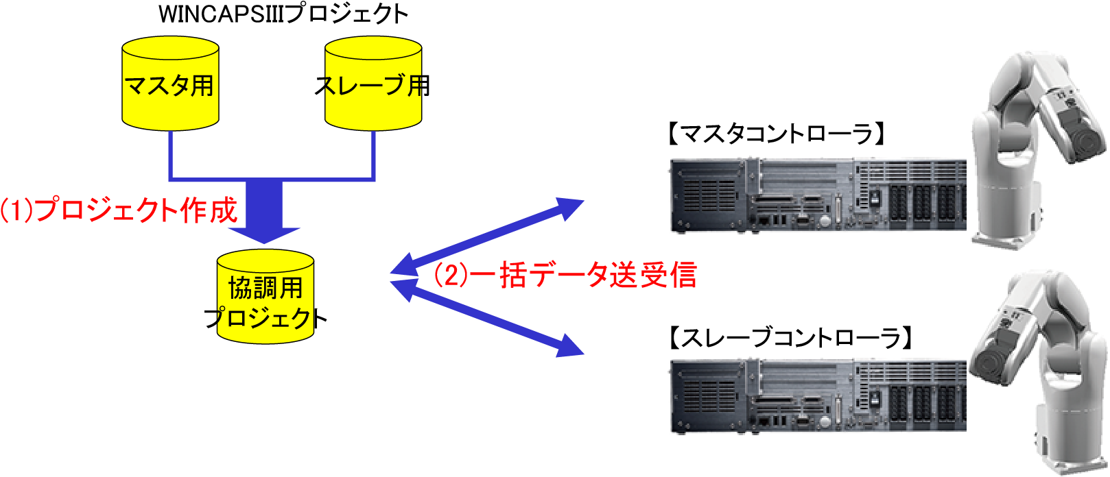 協調制御・デュアルアームツールは、既存のWINCAPSIIIプロジェクトから協調用プロジェクトを作成したり、マスタ/スレーブコントローラのデータ送受信を一括して行うためのツールです。