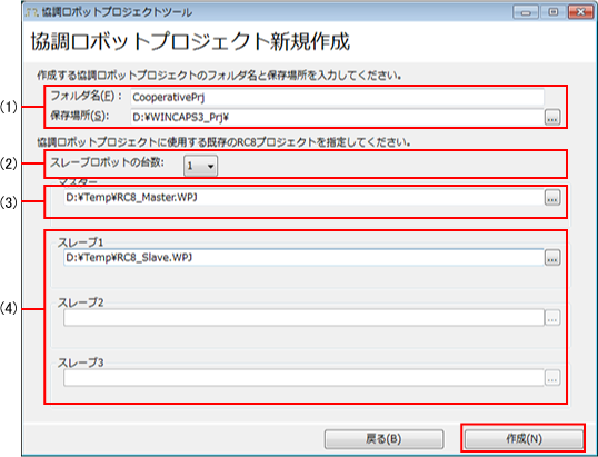 (1)作成する協調プロジェクトのフォルダ名と保存場所、(2)スレーブロボットの台数、(3)マスタコントローラのプロジェクト、および(4)スレーブコントローラのプロジェクトを指定します。
