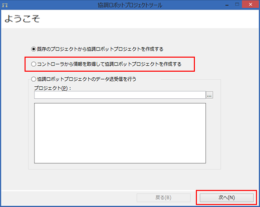 「コントローラから情報を取得して協調ロボットプロジェクトを作成する]を選択します。