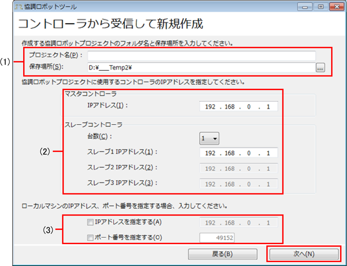 (1)作成するプロジェクト名と保存場所、(2)マスタコントローラのIPアドレス、およびスレーブコントローラの台数、IPアドレスを指定します。(3)受信するパソコンが複数のIPアドレスを持つ場合は、ローカルマシンのIPアドレスも指定します。
