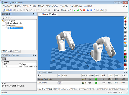[プロジェクト]メニューの[ロボットの追加]を実行し、先に作成した協調用プロジェクトを指定します。3D画面に協調システムで使用する複数台のロボットが表示されます。