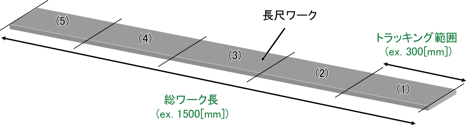 長尺ワークの場合、総ワーク長をトラッキング範囲長で分割したN個の分割領域に対して、それぞれ、通常ワークに対するセンサトラッキングを行っていきます。