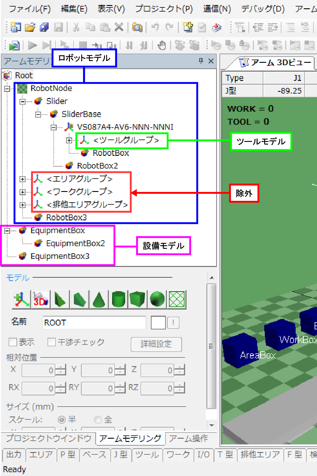 | ロボットモデル | Robot Node以下で、ツールグループ、エリアグループ、ワークグループ、排他グループ以下を除くオブジェクト。 | - |
