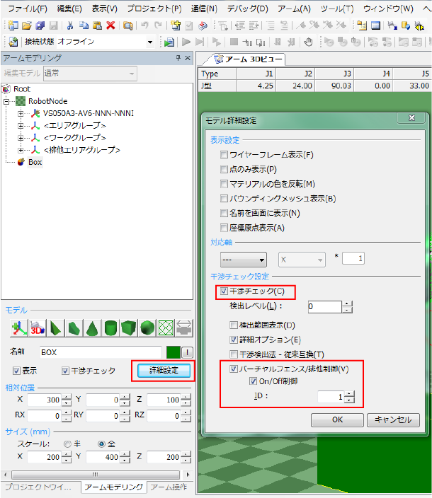 「詳細設定」から「モデル詳細設定」を開き、バーチャルフェンスを有効にします。