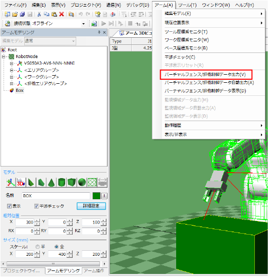出力したバーチャルフェンスのデータを確認したい場合は、メニュー[アーム] - [バーチャルフェンス/排他制御データ表示 (D)]で確認することができます。