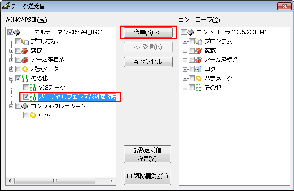 通信設定の方法については、WINCAPSIIIガイドの「ロボットコントローラとの通信」を参照してください。 - 「アームモデル」にチェックを入れると、バーチャルフェンス/排他制御データの作成基のモデルデータをコントローラに送信できます。ただし、コントローラ内に保存領域が不足している場合は、アームモデルの項目は表示されません。