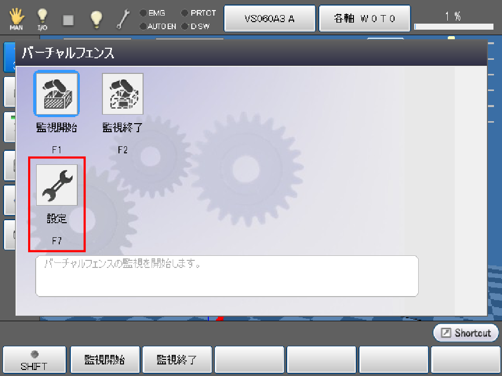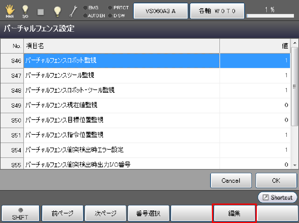 監視の設定を行います。[F7設定]を押すと各パラメータが表示されますので、「366:バーチャルフェンス設定」を有効にし、必要があれば他パラメータのデフォルト値の変更を行います。値の変更は[F5編集]を押してください。