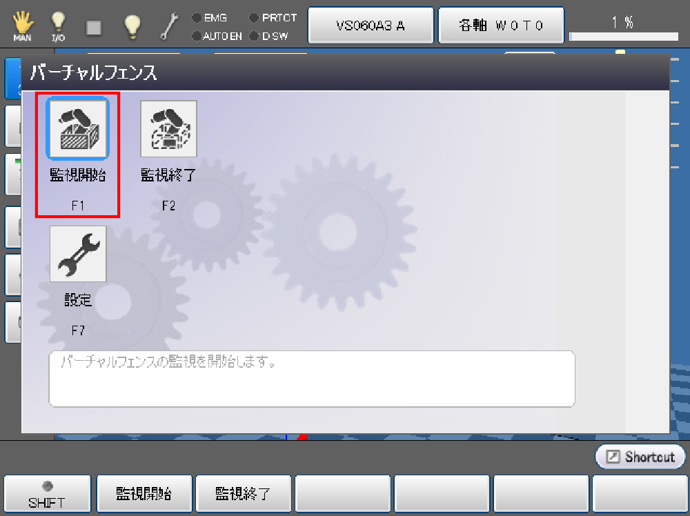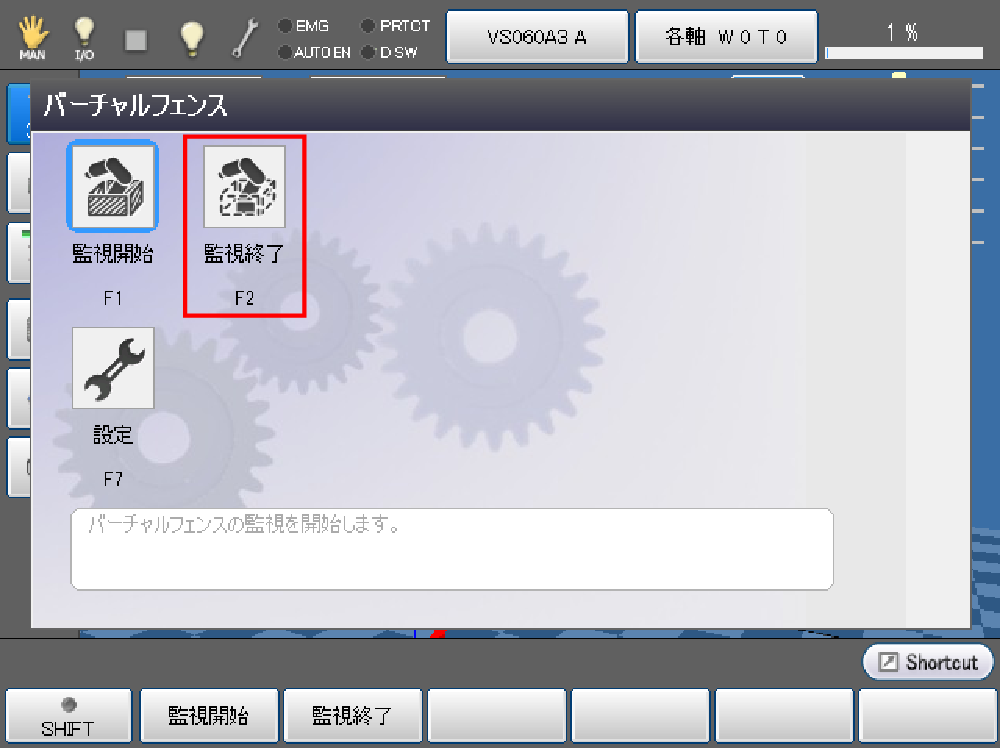 - バーチャルフェンス機能が有効でない場合は、ティーチングペンダント、ミニペンダント、コマンドで開始を行っても監視は開始しません。