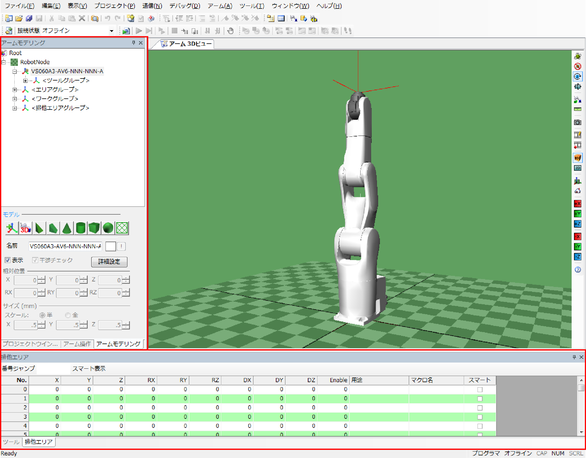 アームモデリングウィンドウで排他エリアの「表示」にチェックを入れると、エリアが表示されます。