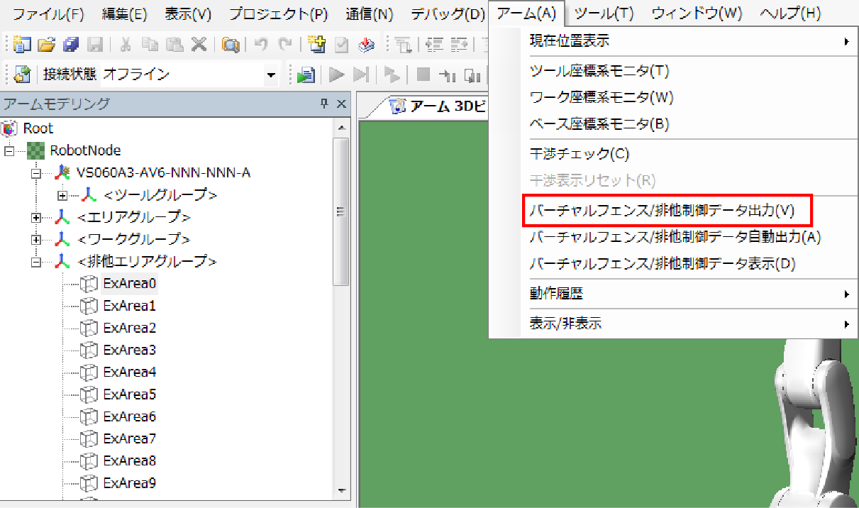 メニュー[アーム(A)]の[バーチャルフェンス/排他制御データ出力(V)]を選択します。