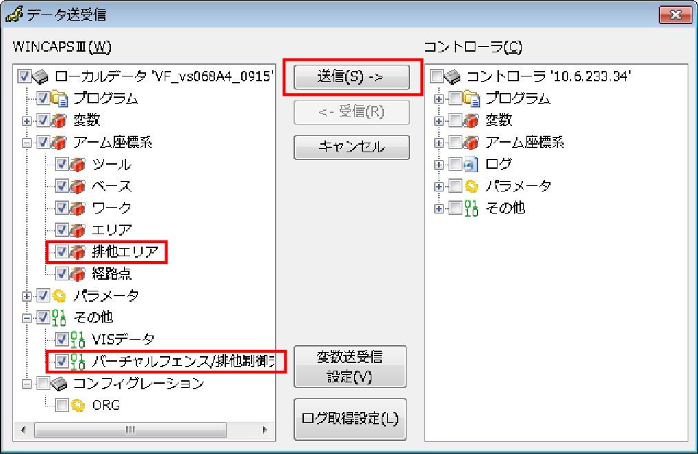 「排他エリア」及び「バーチャルフェンス/排他制御データ」にチェックが付いていることを確認して送信してください。