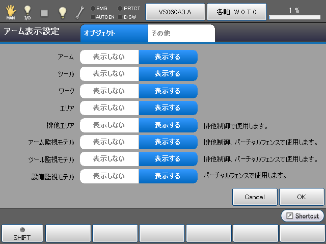 操作経路:基本画面 - [F2 アーム] - [F6 補助機能] - [F7 表示設定]