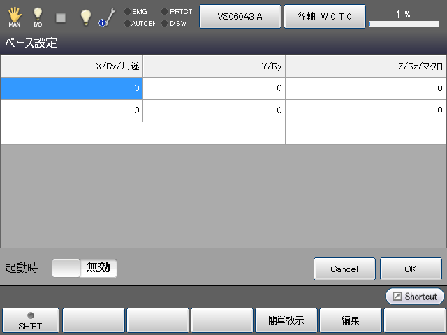 | [F5 編集] | 変更したい座標要素を選択し、[編集]を押すと、テンキーが表示されます。 テンキーを使用して値を入力し、テンキー上の[OK]を押すと、値が変更されます。 変更した値は、[ベース設定]ウィンドウの[OK]を押すことで確定します。 |