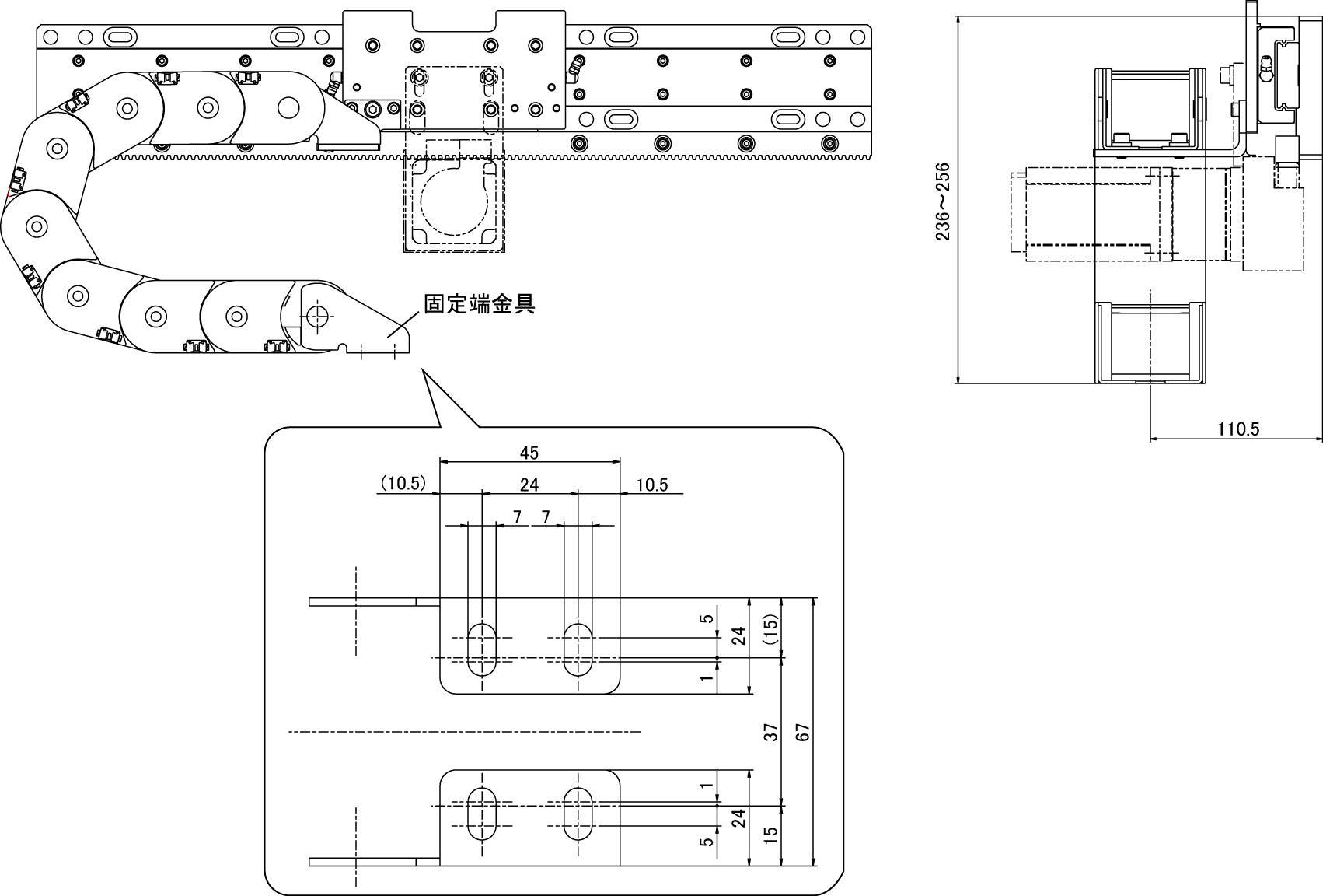 ケーブルベヤ固定端の設置に関する寸法を下図に示します。