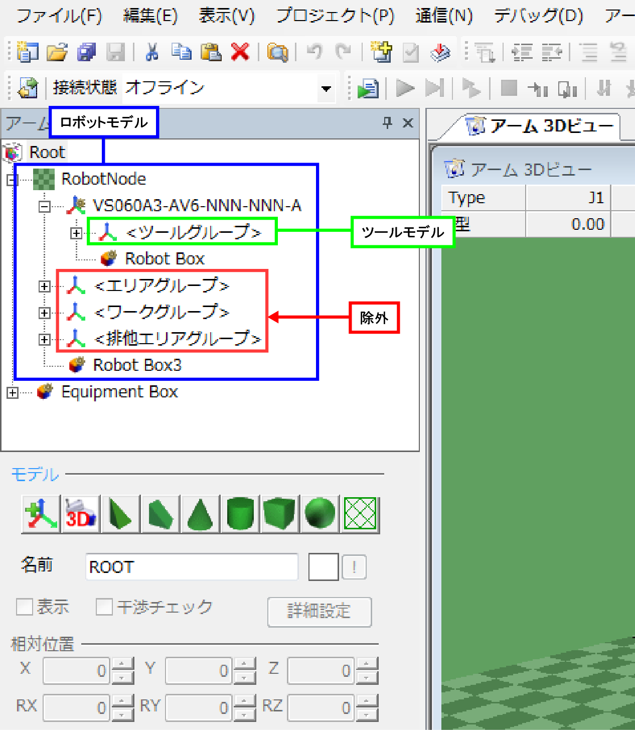 | ロボットモデル | Robot Node以下で、ツールグループ、エリアグループ、ワークグループ、排他グループ以下を除くオブジェクト。 | - |