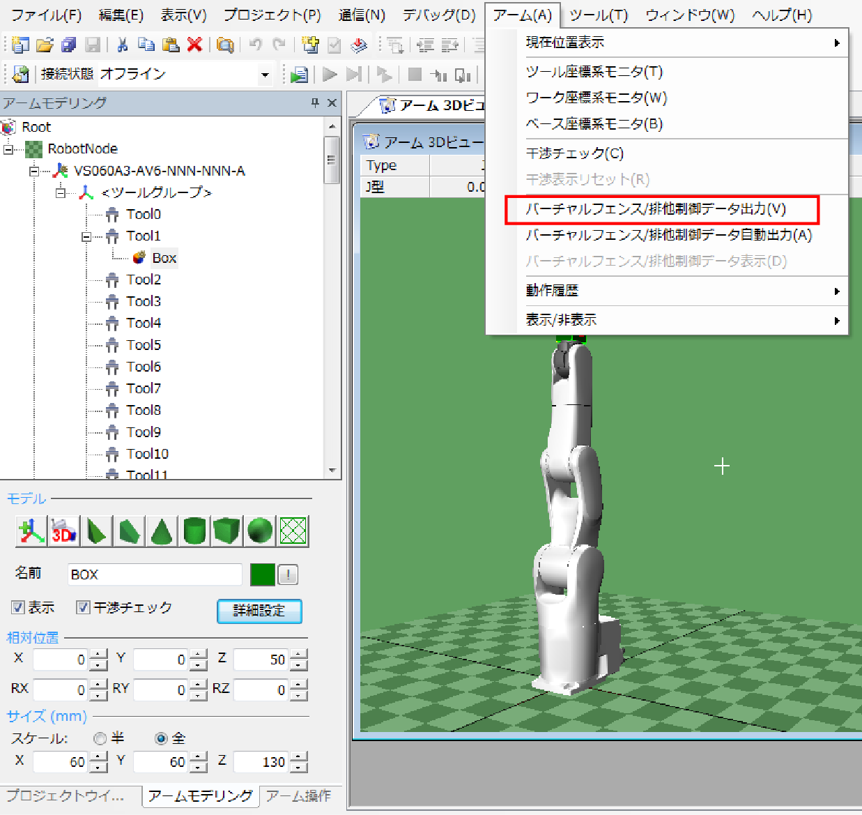 メニュー[アーム] - [バーチャルフェンス/排他制御データ出力(V)]