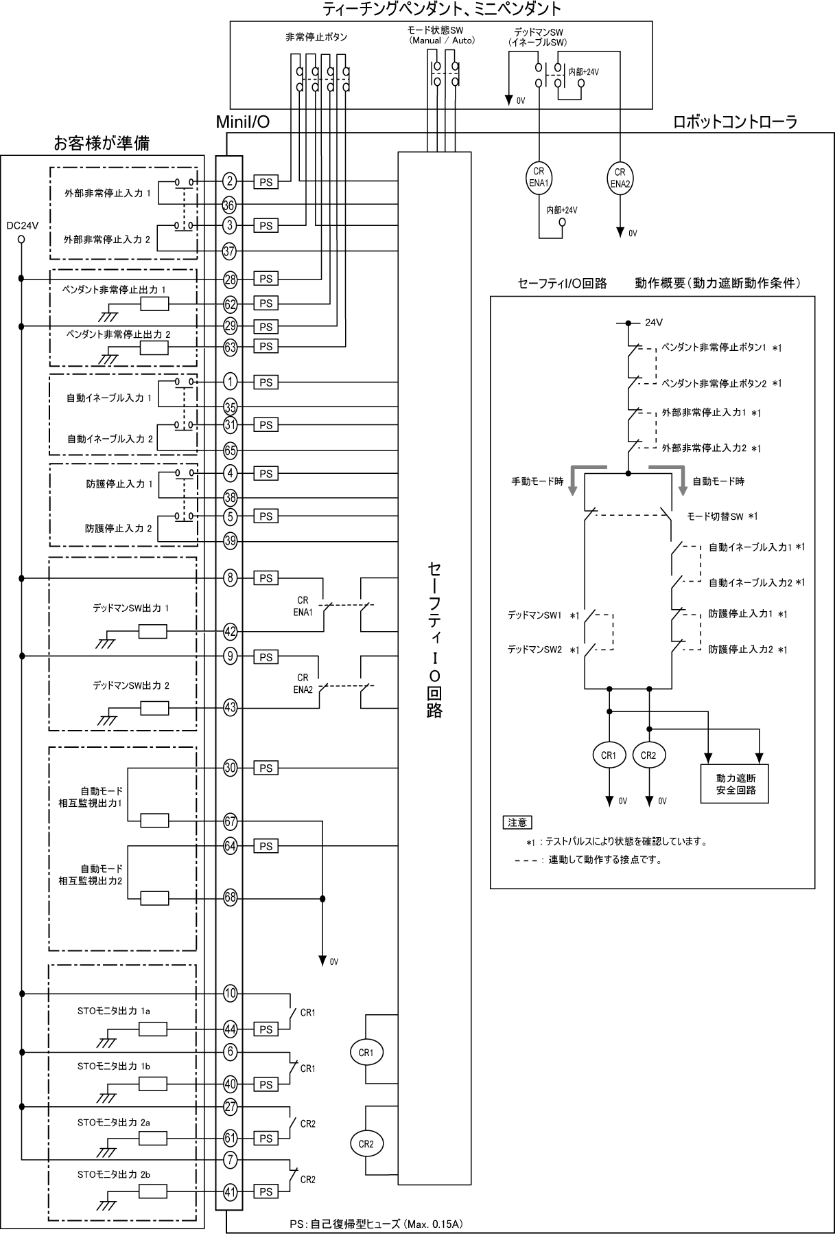 コントローラの安全回路の内部接続等価回路を下図に示します。実際の安全回路はセーフティリレー等から構成されています。