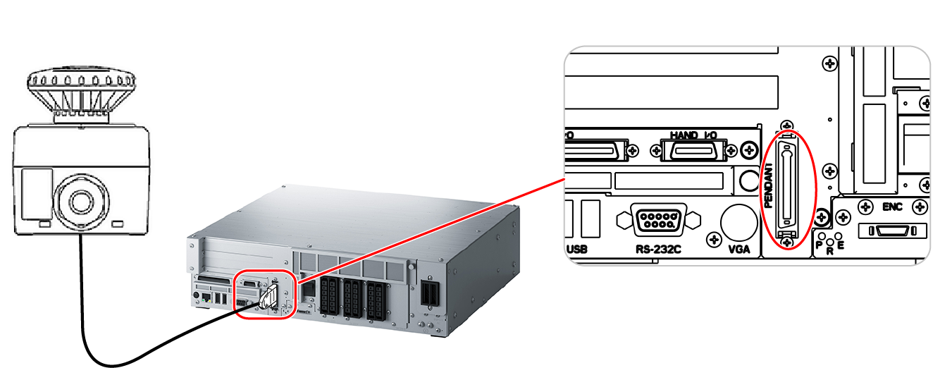 非常停止スイッチボックスは、下図に示すようにロボットコントローラのPENDANTコネクタに接続してください。