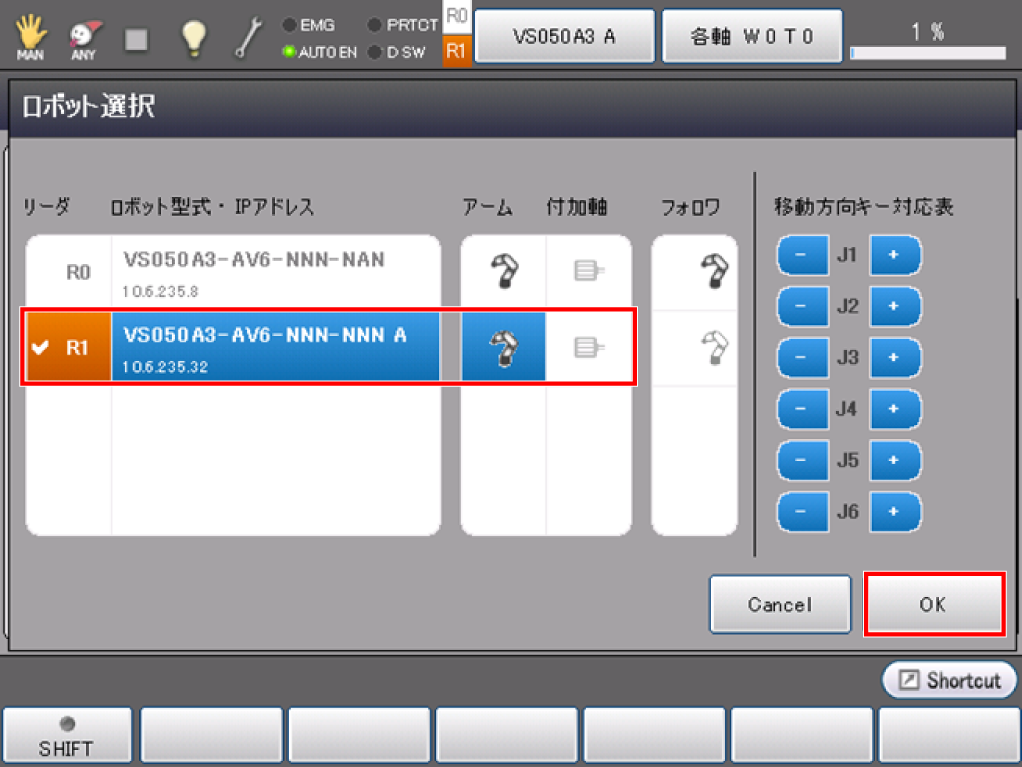 画面上部にある「ロボット選択」ボタンを押してロボット名「R1」を選択し「OK」を押すことで、Robot1をリーダにすることができます。