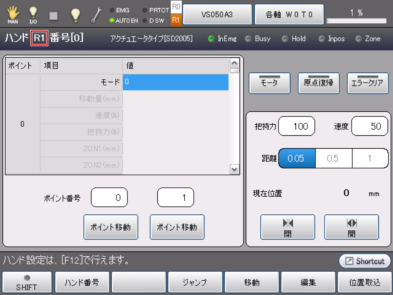 初期設定画面でハンド画面に切替えると、リーダに設定したロボットのハンド画面になります。上部のステータス欄にロボット番号が表示されています。
