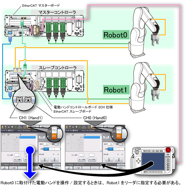 この場合、電動ハンドコントロールボードはRobot1のロボットコントローラに実装されているため、Robot0の電動ハンドを操作/設定するには、Robot1をリーダに指定しなくてはなりません。