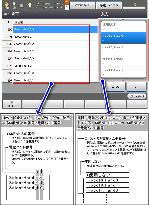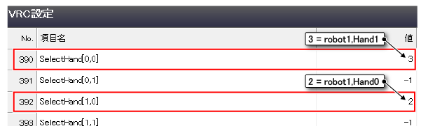 VRC設定を下図のように設定すると、"SelectHand[0,0]"を使用する場合、Robot0に取り付けられた電動ハンドを制御することとなります。