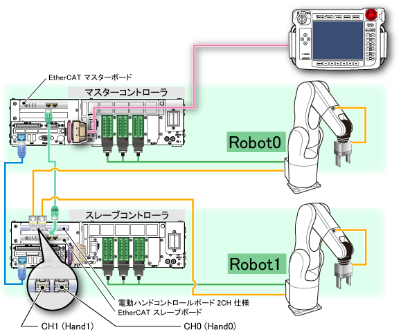 協調機能で電動ハンドを使用する際は、Robot1のロボットコントローラに接続された電動ハンドを、Robot0の手先に取付けて使用するような場面も想定されます。