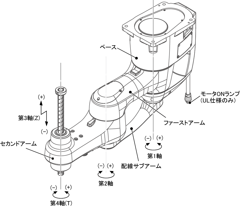 軸受の早期摩耗を防止するため、該当の軸を、1日に数回以上、ある程度大きな角度で動作させるようにしてください。 - お客様準備のハンドおよびハンド用エア配管の形状、取り付け方法によっては、アームをたたむときに本体に接触する可能性があります。ティーチングにはご注意ください。