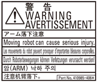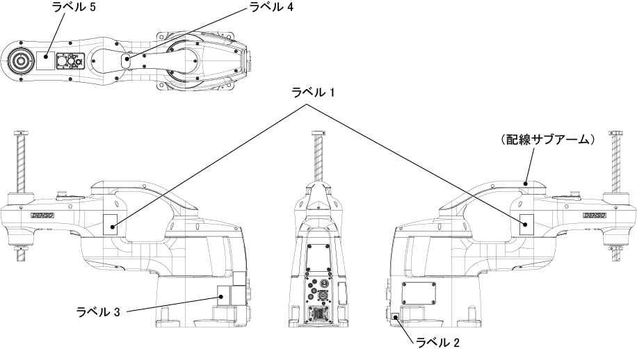 ロボット本体には、下表の警告ラベル・注意ラベルが貼ってあります。貼付部付近には特有の危険がありますので、ラベルの記載事項は遵守してください。