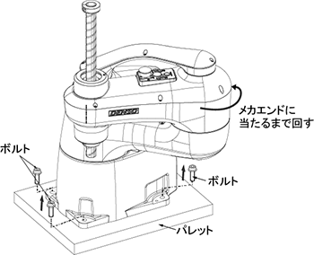 第2軸をメカエンドまで押し当て、安全な運搬姿勢にした上で、固定用ボルトを外し、パレットからロボット本体を外します。